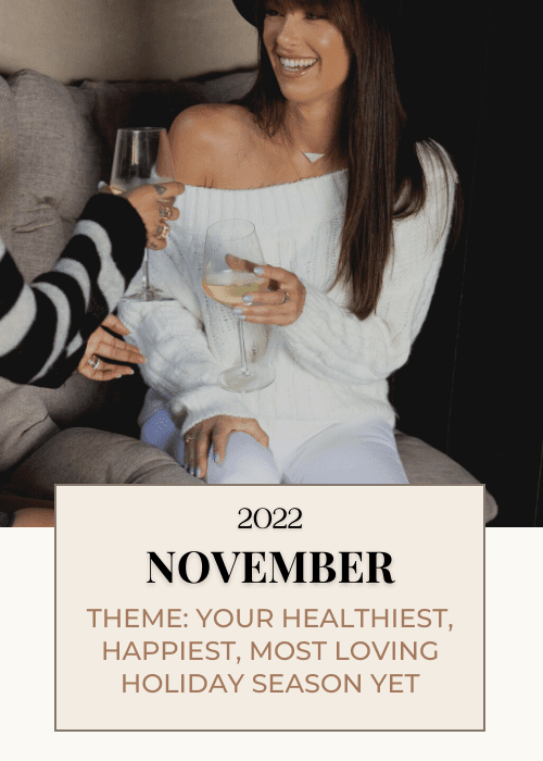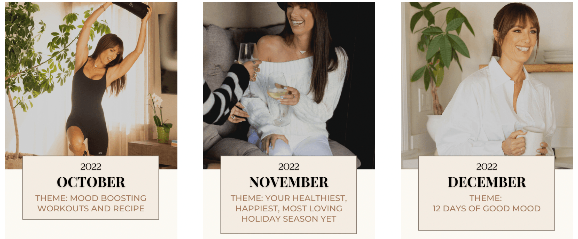 Every month you will receive a new recipe, workout calendar and mood boosting workout, plus bonus content as I am inspired to share with you all. Some months it will be a private podcast episode, other times it will be a coaching video, holiday guide, LIVE cooking class, evenings with me inside my home while I do a Q&A and more. All of my content will include things I utilize in my personal life that I cannot wait to share with you all!